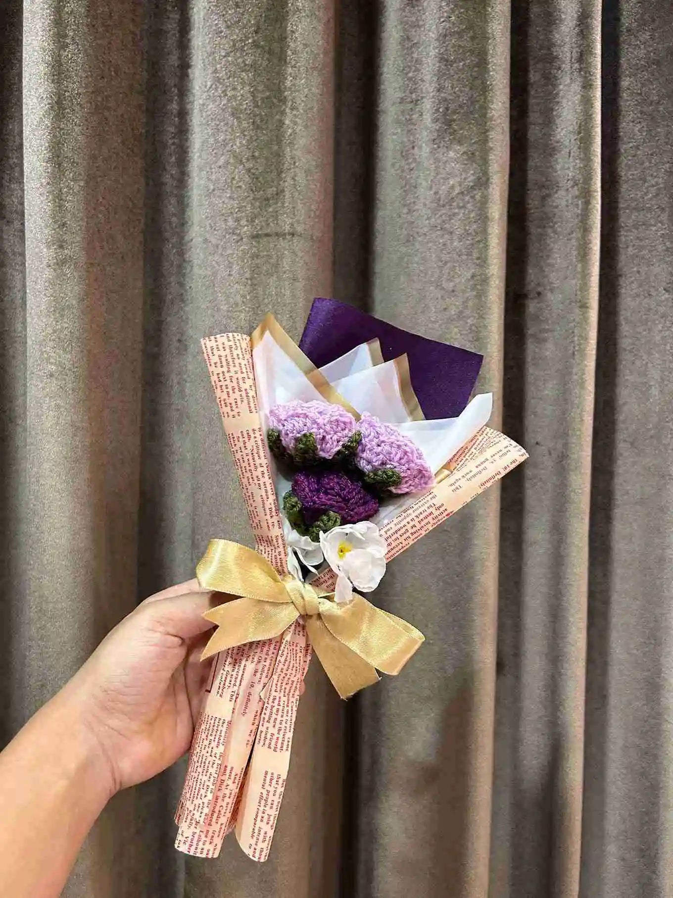 Graceful, calming, and beautifully detailed, this Lavender Rose Handmade Crochet Bouquet captures the essence of soft affection. Thoughtfully arranged with three crochet roses in soothing shades of lavender and deep purple, this bouquet is elevated with tiny white accent flowers and wrapped in luxurious bouquet paper—finished with a crisp white ribbon bow for a clean, elegant touch.