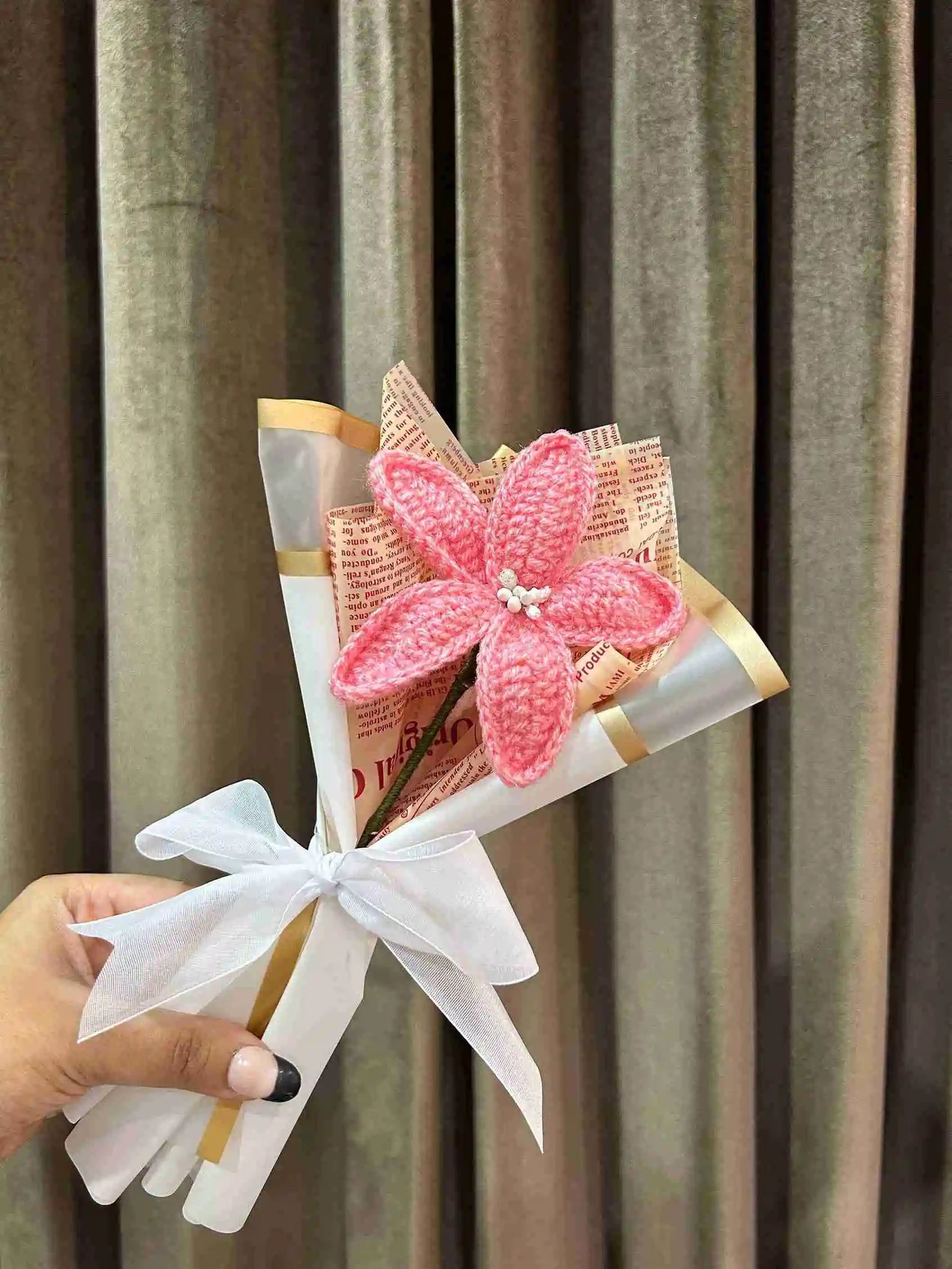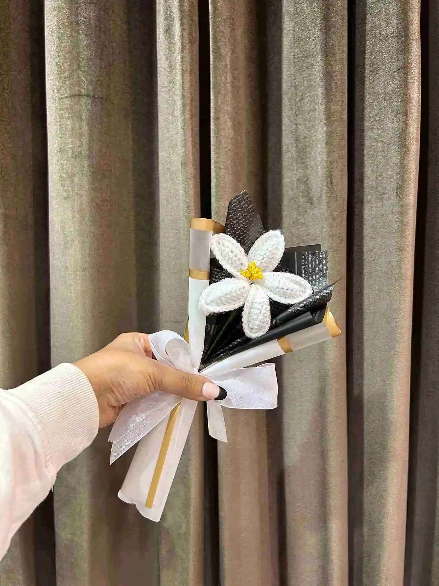 Delicate, graceful, and timeless—this Single Lily Handmade Crochet Bouquet is a subtle expression of beauty. Crafted with soft, high-quality wool yarn, the elegant lily bloom is wrapped in minimalist premium bouquet packaging, tied together with a neat white ribbon.