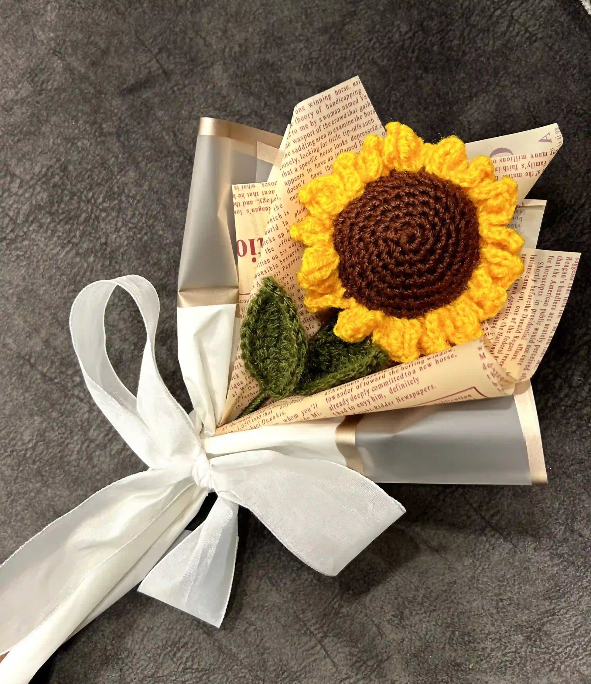 Add a burst of sunshine to any space with our Sunflower Handmade Crochet Bouquet, inspired by timeless crochet sunflower bouquet patterns. Lovingly handcrafted with premium yarn, this bouquet features a single vibrant sunflower, two soft green leaves, and a delicate white ribbon bow for a charming finish.
