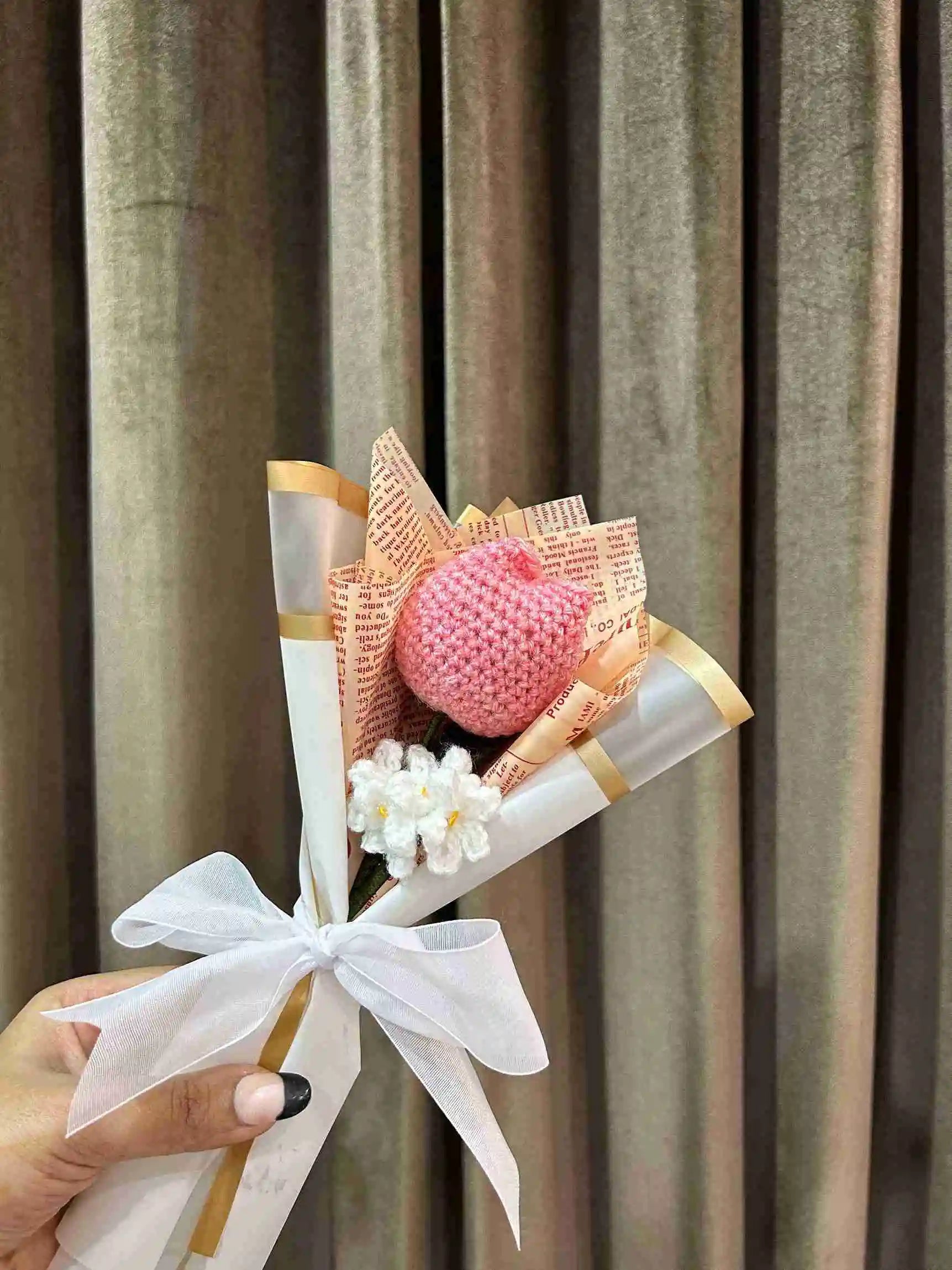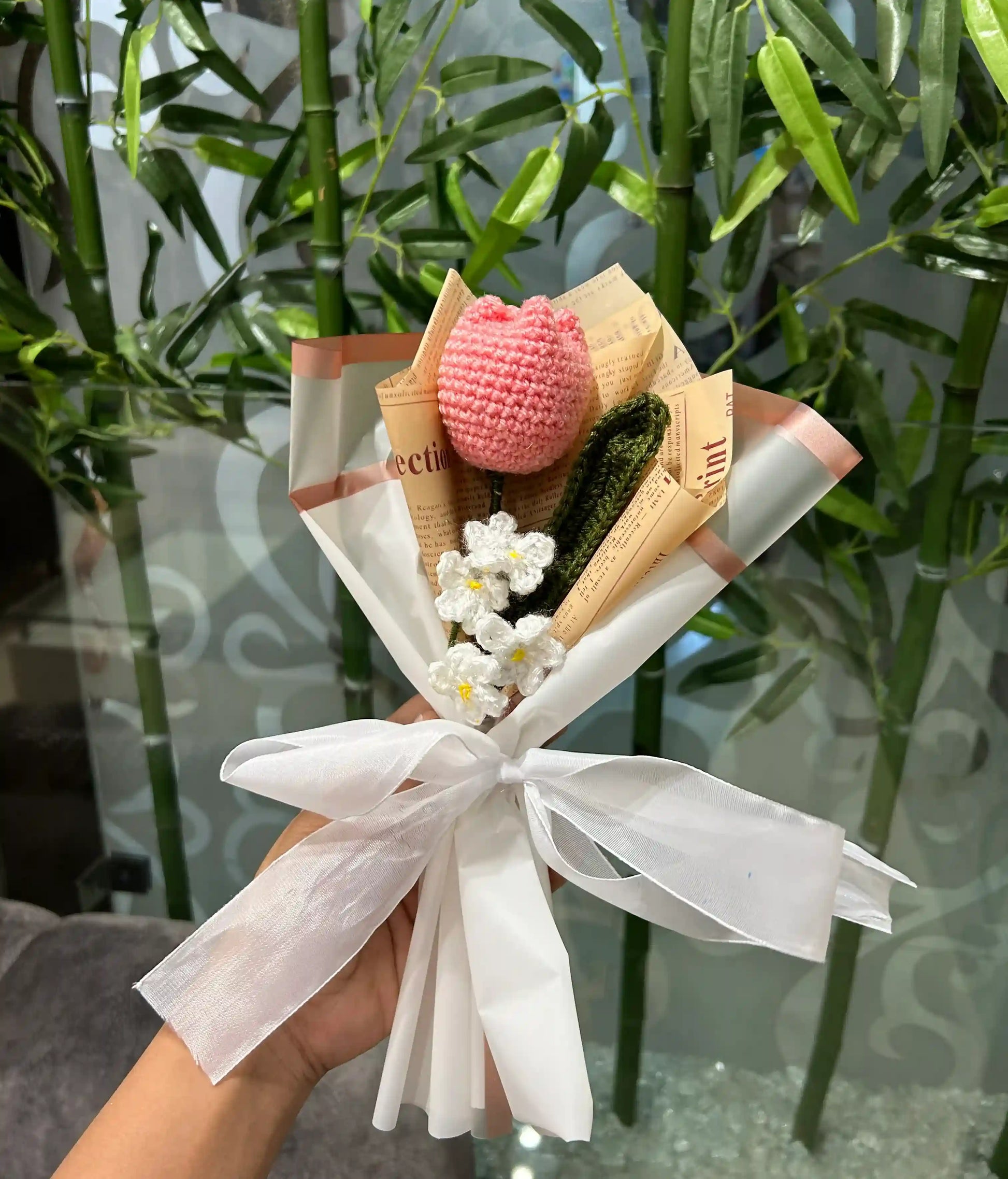 Delicate, charming, and thoughtfully handmade — the Pink Tulip & Forget-Me-Not Crochet Bouquet blends the elegance of pink tulips with the soft touch of tiny white forget-me-nots. Crafted with care using high-quality yarn, this bouquet is designed to stay fresh-looking for years, making it a meaningful gift that lasts.